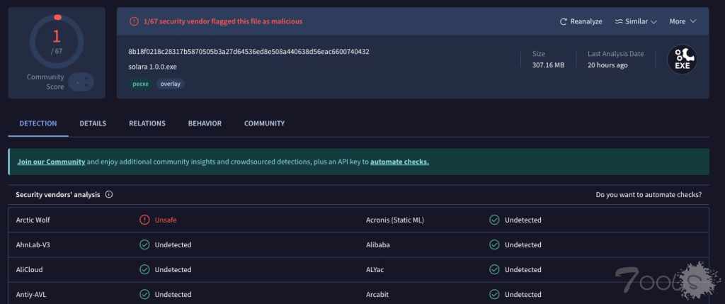 尽管其有效载荷十分复杂,但该可执行文件在 VirusTotal 上仅被一个杀毒引擎标记为病毒,因为静态和启发式扫描器分析的是投放器干净的外层,而不是其隐藏的 JavaScript 内容。