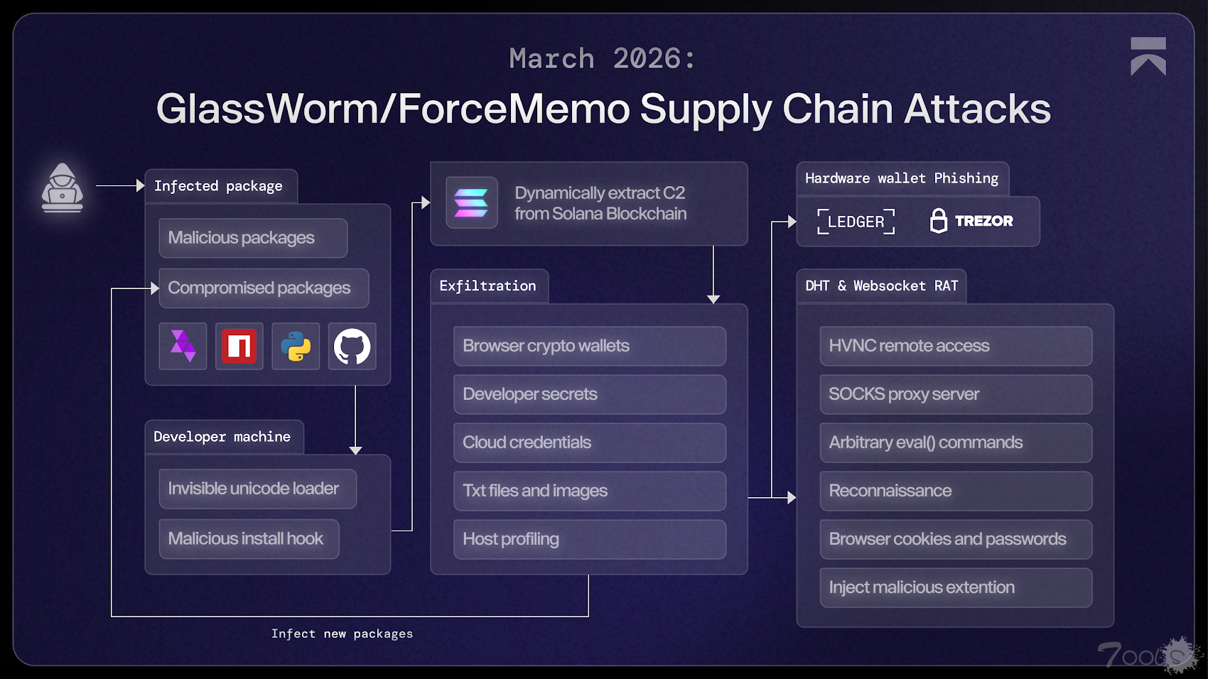 “这并非 GlassWorm 首次在扩展程序中使用本地编译代码 。然而,它并非直接使用二进制文件作为有效载荷,而是将其作为一种隐蔽的间接手段,用于已知的 GlassWorm 投放器,该投放器现在可以秘密感染系统上所有其他它能找到的 IDE。”