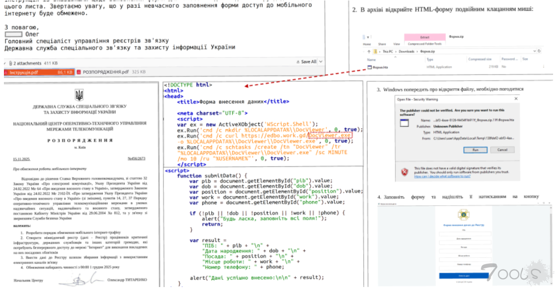 根据 CERT-UA 的说法,攻击链的起点是一封声称是人道主义援助提案的电子邮件,敦促收件人点击链接,该链接会将他们重定向到一个合法网站(该网站因跨站脚本 (XSS) 漏洞而被入侵)或一个借助人工智能 (AI) 工具创建的虚假网站。